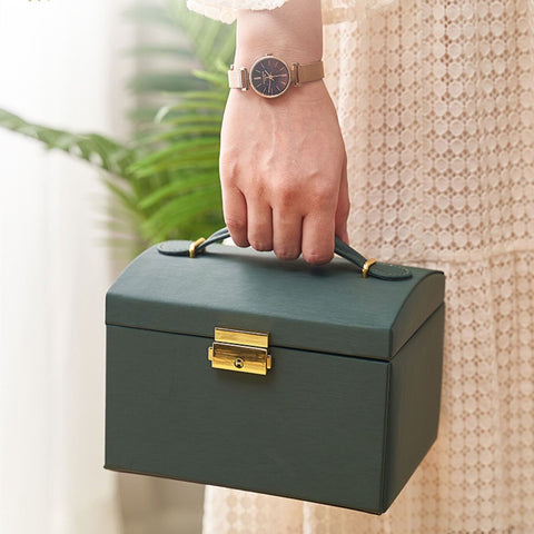 - POTABLE MULTIPURPOSE CASE: Handle on the top makes the jewelry case portable, and allows you to take it wherever you want. And the removable compartment and drawer with practical divisions for various pieces of jewelry such as rings, earrings, and chains, close it with a press button, it quickly transforms into a small travel case.